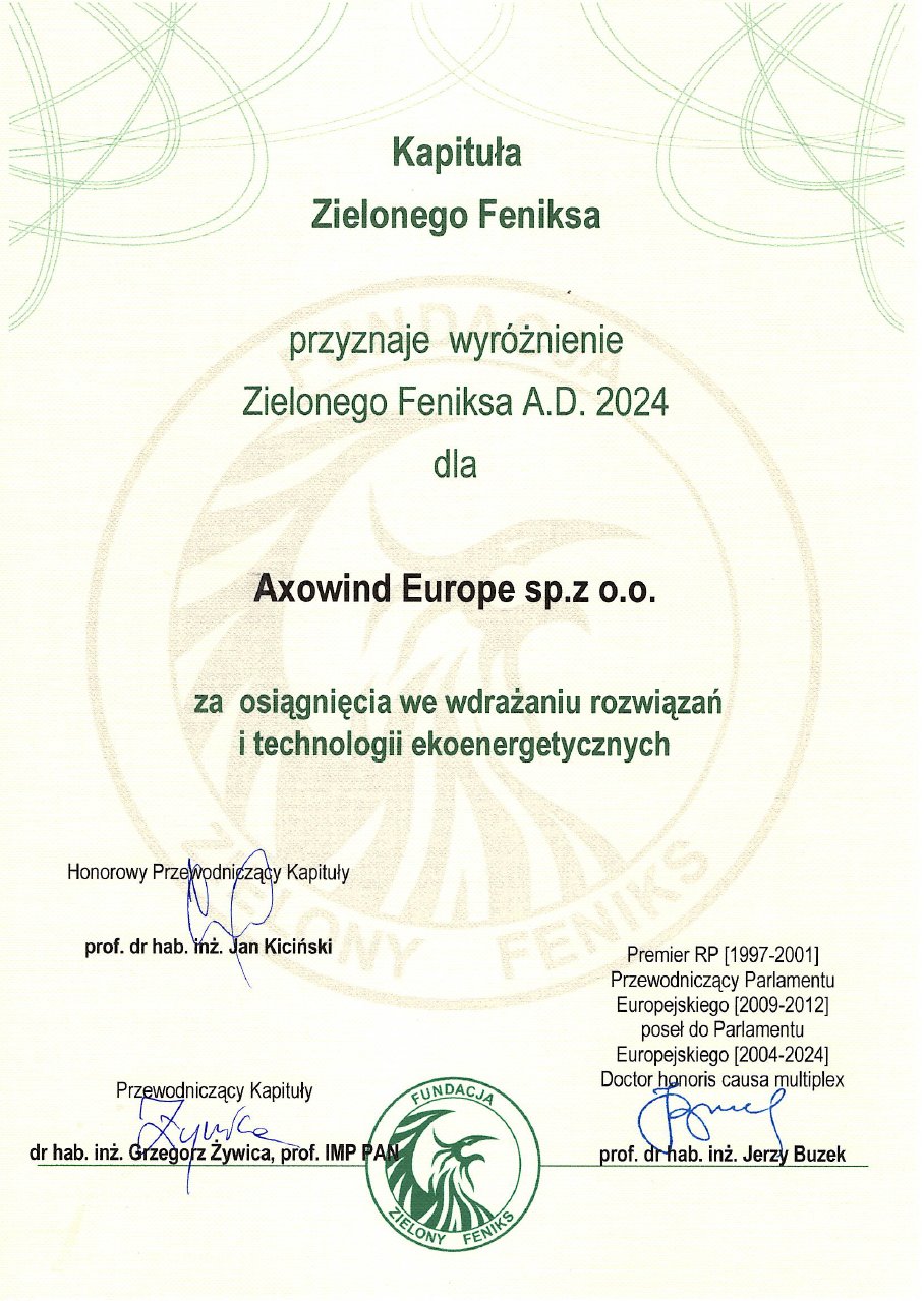 Im Jahr 2024 erhielten wir den Green Fenix Award für unsere Leistungen bei der Umsetzung von Ökoenergielösungen und technologien.
